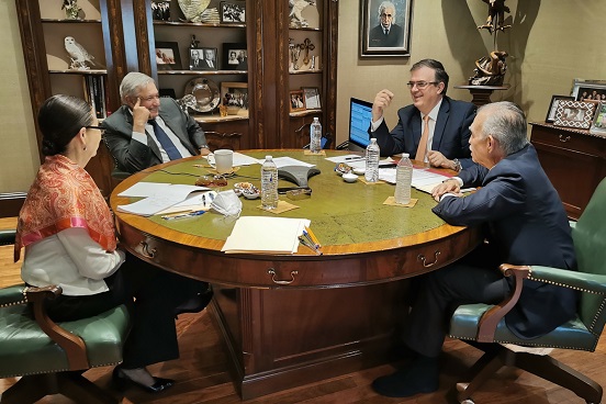 El presidente López Obrador estuvo acompañado por el secretario de Relaciones Exteriores, Marcelo Ebrard Casaubon, así como por Alfonso Romo Garza.