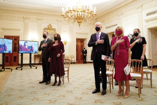 El presidente estadunidense, Joe Biden, y la primera dama, Jill Biden, acompañados por la vicepresidenta, Kamala Harris, y su esposo, Doug Emhoff, escucharon la oración inaugural presidencial en el Comedor Estatal de la Casa Blanca, una liturgia ofrecida en formato virtual debido a las medidas de prevención por la pandemia de covid-19.