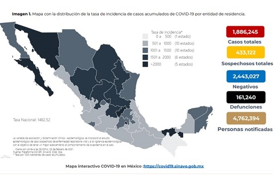 Entre martes y miércoles se sumaron 14 mil 544 casos positivos estimados de Covid-19, por lo que hoy la cifra nacional es de 2 millones 82 mil 399. Por prueba de laboratorio se confirmaron mil 707 fallecimientos, para un acumulado de 161 mil 240 personas que han perdido la vida por causa de las complicaciones graves de la enfermedad. Los casos confirmados aumentaron en 12 mil 513 casos para un total de 1 millón 886 mil 245.