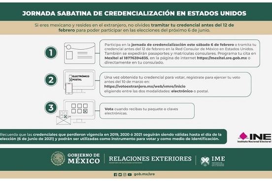 La red consular de México en Estados Unidos llevará a cabo una gran jornada sabatina en todos sus consulados el próximo 6 de febrero, atendiendo estrictamente todas las disposiciones sanitarias locales. Esta jornada estará enfocada en la expedición de credenciales para votar para mexicanos residentes en los EE. UU. y también se expedirán pasaportes y matrículas consulares.