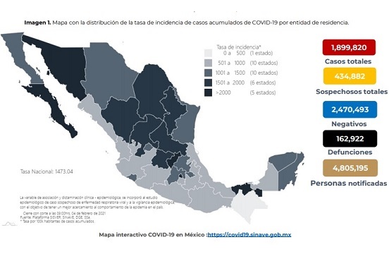 En México los decesos por Covid-19 se mantiene al alza. El reporte técnico diario sobre el desarrollo de la pandemia detalla que entre miércoles y jueves se confirmaron por laboratorio mil 682 fallecimientos por el nuevo coronavirus, mientras que los casos estimados se elevaron en 13 mil 975, para un total de dos millones 96 mil 374, los casos confirmados crecen en 13 mil 575 para un total de 1 millón 899 mil 820.