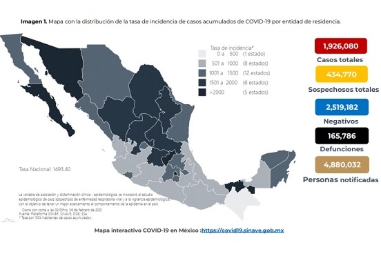 La Secretaría de Salud (Ssa) reportó que los decesos confirmados por Covid-19 en México se incrementaron del viernes al sábado en mil 496, para un acumulado de 165 mil 786, mientras que los casos estimados aumentaron en 12 mil 521, para un total de 2 millones 122 mil 323. Los casos confirmados crecieron en 13 mil 209 casos para un total de 1 millón 926 mil 80.