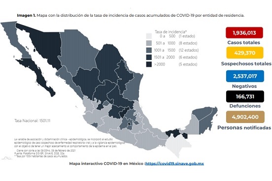 En las pasadas 24 horas se confirmaron 531 fallecimientos por Covid-19, con lo cual el registro nacional acumulado llegó a 166 mil 731, los casos confirmados aumentaron en 3 mil 868 para un total de 1 millón 936 mil 13 casos informó la Secretaría de Salud.