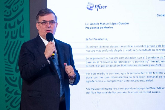 «Les comparto comunicación de Pfizer al Presidente Andrés Manuel López Obrador, se reanuda el suministro de 491,400 dosis a nuestro país en la próxima semana que inicia el 15 de febrero. Buena noticia!!», escribio el canciller en Twitter.