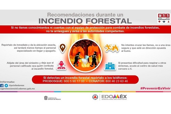 Si no se cuenta con el conocimiento ni el equipo de protección necesarios para el combate de incendios forestales, Protección Civil mexiquense pide a la población alejarse del área de incendio, no arriesgarse y reportarlo de inmediato a las autoridades competentes, a fin de que éstas tengan la ubicación exacta y el personal especializado tarde menos tiempo en llegar y sofocarlo.