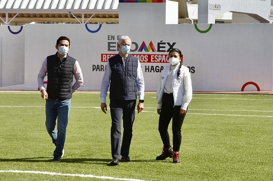 Acompañado por la Presidenta municipal de Jiquipilco, Marisol González Torres, el Gobernador Alfredo Del Mazo indicó que la entrega y rehabilitación de espacios deportivos se lleva a cabo en todo el territorio mexiquense.