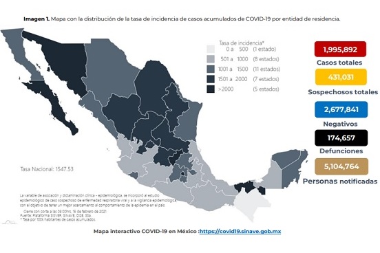 Hoy se confirmaron 450 fallecimientos por Covid-19, con lo cual el registro nacional subió a 174 mil 657, mientras la tendencia de la curva epidémica hace dos semanas mantuvo una disminución de 26 por ciento, con respecto a la semana previa, informó José Alomía, director de Epidemiología de la Secretaría de Salud.
