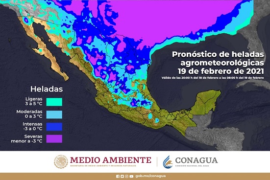 - Temperaturas mínimas para la madrugada del miércoles de -10 a -5°C con heladas: zonas montañosas de Sonora, Tamaulipas, San Luis Potosí, Zacatecas, Guanajuato, Michoacán, Estado de México, Hidalgo y Puebla.