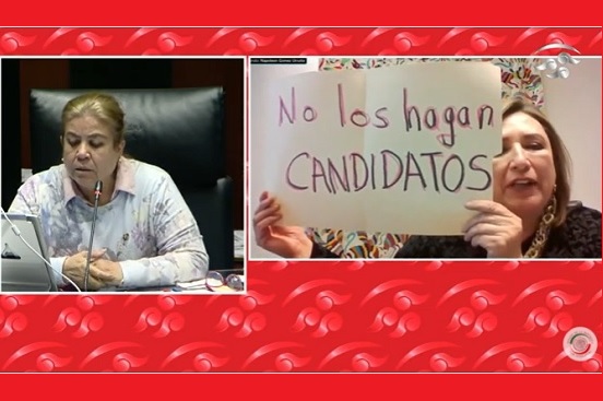 Sin embargo, de manera indirecta al caso Macedonio, la senadora panista Xóchitl Gálvez mostró una cartulina en su pantalla en la que protestó al escribir: “NO LOS HAGAN CANDIDATOS”.
