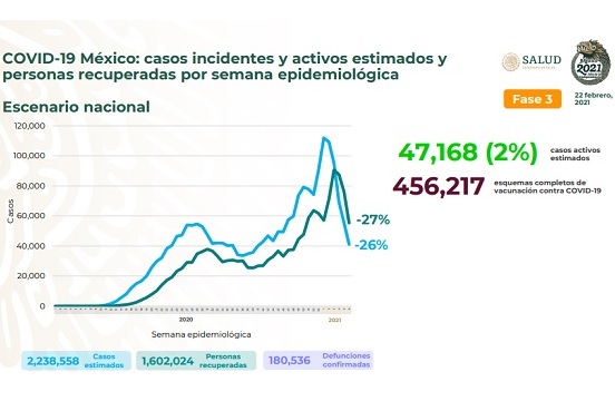 En las pasadas 24 horas se confirmaron 429 fallecimientos causados por Covid-19, con lo que el registro nacional se ubicó en 180 mil 536 personas que han perdido la vida por esta causa. Los casos confirmados crecieron en 2 mil 252 para un total de 2 millones 43 mil 632. El reporte técnico indica que la tendencia de la curva epidémica se mantiene en descenso por quinta semana consecutiva. Tal disminución es de 26 por ciento con respecto a la semana pasada.