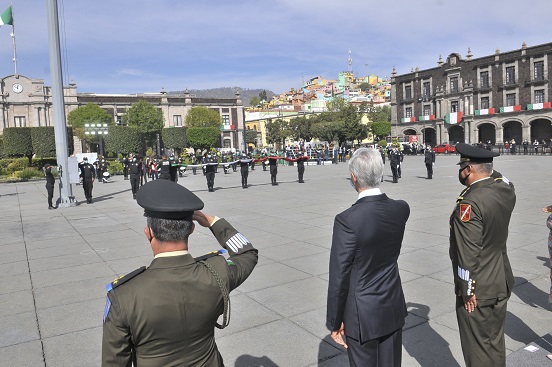 El Gobernador Alfredo Del Mazo Maza encabezó la ceremonia conmemorativa al Día de la Bandera, junto con los titulares de los Poderes Legislativo y Judicial del Estado de México, con quienes rindió los honores correspondientes al lábaro patrio.