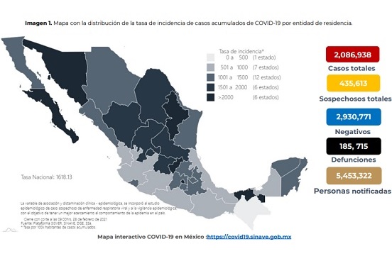 México reportó este domingo 458 nuevas muertes relacionadas con el Covid-19, elevando la cifra total de decesos por esa causa a 185 mil 715 en el país. Los casos confirmados crecieron en 2 mil 810 para un total de 2 millones 86 mil 938.