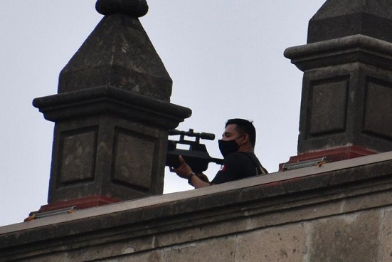 Aclararon que se trata de personal encargado del resguardo de Palacio Nacional y que portan un rifle para derribar drones, el cual al apuntar hacia el drone con la mira telescópica, «dispara un rayo invisible que neutraliza los sensores del dron», dijeron fuentes policiacas.