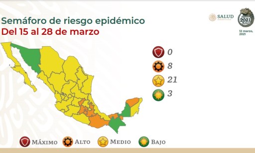 En la actualización del semáforo epidemiológico, Ricardo Cortés Alcalá, director de Promoción de la Salud, informó que no hay entidades en rojo, o riesgo máximo de contagio, ocho permanecen en naranja o riesgo alto; 21 en amarillo, o riesgo medio, mientras que Sonora, Chiapas y Campeche, se clasificaron en riesgo bajo o color verde.