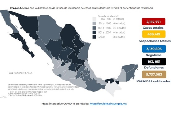 A más de un año del inicio de la pandemia de Covid-19, los contagios confirmados suman 2 millones 157 mil 771, con un aumento de 6 mil 743 casos en las últimas 24 horas, mientras que los decesos se incrementaron en 709, para un acumulado de 193 mil 851, mientras que las recuperadas suman un millón 696 mil 739.