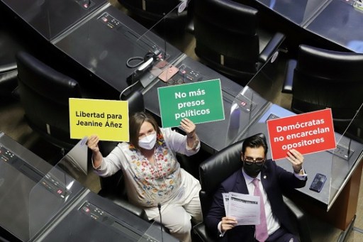 Fue aquí cuando senadores del PAN, entre ellos Xóchitl Gálvez, sacaron pancartas en las que se leía: “No más presos políticos” y “Libertad para Jeanine Añez”, en alusión a la expresidenta Interina de Bolivia, Jeanine Añez, quien según los legisladores es víctima de una persecución política, a una revancha y no a la aplicación imparcial de la ley.