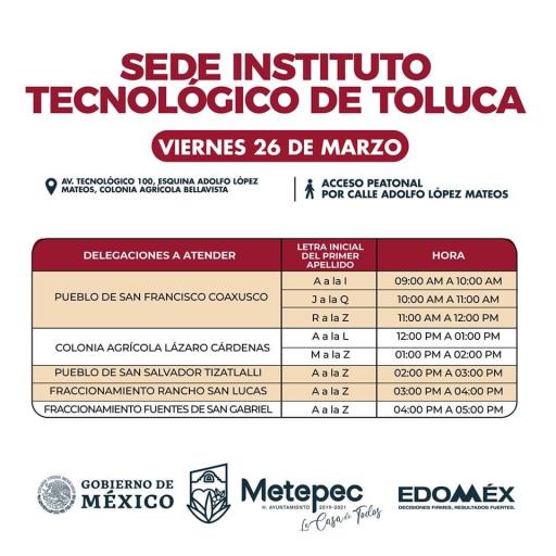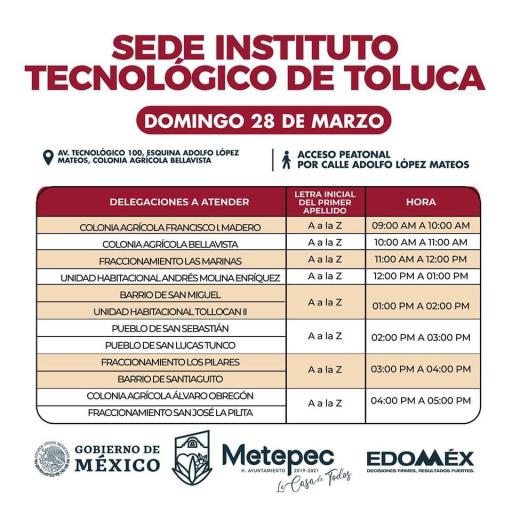 Los lugares dispuestos son: el Colegio de Estudios Científicos y Tecnológicos del Estado de México (CECyTEM) plantel Metepec, ubicado en la calle Moctezuma esquina avenida Gobernadores; el Tecnológico Nacional de México -antes Tecnológico de Toluca-, con domicilio en avenida Tecnológico esquina Adolfo López Mateos, colonia Agrícola Bellavista y en la Universidad del Valle de México (UVM), con dirección en Avenida Las Palmas número 439 en San Jorge Pueblo Nuevo, en ésta última sede el acceso también podrá ser con vehículo.