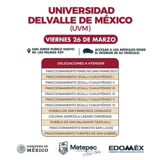 Destacar que se tienen dispuestas las vacunas necesarias de la farmacéutica Pfizer para una población aproximada de 33 mil adultos mayores. La programación de las sedes y las localidades donde serán atendidas en cada una de ellas, se pueden consultar en twitter: @MetepecGobierno y @GabyGamboa_S.