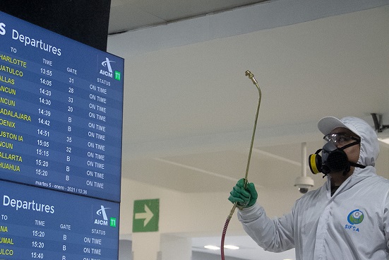 En este periodo de asueto que comprende del sábado 27 de marzo al domingo 11 de abril, se intensificará la sanitización en salas de última espera, pasillos de llegadas y salidas de pasajeros, zonas de comida, oficinas, módulos de información, baños y en área operativa como plataformas.