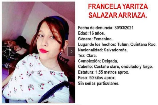 Este miércoles autoridades informaron de la desaparición de la joven de nombre Francela Yaritza Salazar Arriaza, de 16 años de edad, y quien fue vista por última vez en el municipio de Tulum. De acuerdo al presidente de El Salvador, Nayib Bukele, la principal hipótesis es que huyó del agresor de su hermana menor, y quien probablemente también habría abusado de ella.