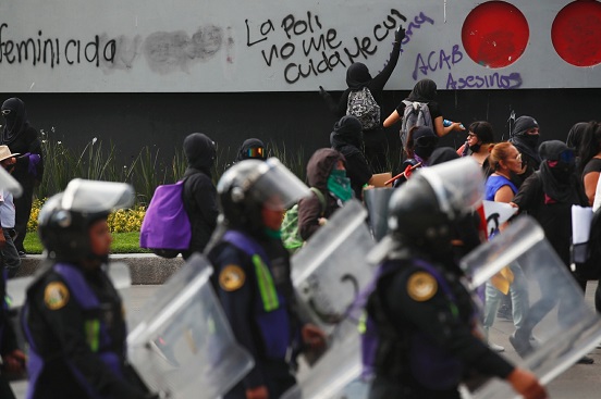 Luego de llevar a acabo su protesta en la mencionada sede, las feministas regresaron nuevamente a pie hacia el Centro Histórico. Luego de que lograran retirar algunas de las vallas metálicas que resguardan Palacio Nacional, se enfrentaron con mujeres policías, quienes se encuentran rodeando el inmueble con escudos de plástico y haciendo uso de extinguidores para tratar de dispersar a quienes tratan de acercarse al edificio.