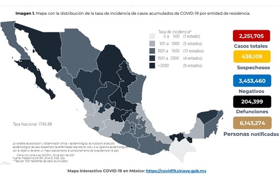 En la conferencia vespertina en Palacio Nacional que hoy se reanudó luego de los días de asueto de Semana Santa, José Luis Alomía, director de Epidemiología de la Secretaría de Salud, indicó que entre domingo y lunes se registraron 252 fallecimientos por Covid-19 para un total hasta hoy de 204 mil 399. Los casos confirmados incrementaron en mil 247 para un acumulado de 2 millones 251 mil 705.
