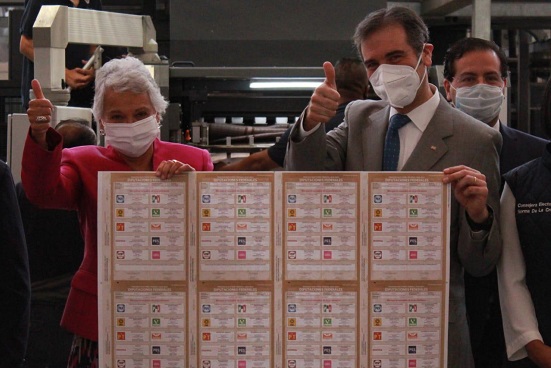 Acompañada del consejero presidente, Lorenzo Córdova, y las consejeras y consejeros del INE, se acudió este martes por la mañana a los Talleres Gráficos de México para atestiguar el inicio de la producción de las boletas del proceso electoral 2021, que se celebrarán el próximo 6 de junio.