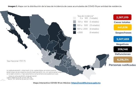 Sobre el comportamiento de la pandemia de coronavirus, el reporte indica que en las pasadas 24 horas se confirmaron 548 fallecimientos. Hasta hoy, 206 mil 146 personas han perdido la vida por esta causa. Los casos confirmados incrementaron en 5 mil 140 para un acumulado de 2 millones 267 mil 19.