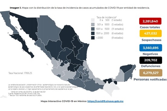 Ssa reportó la confirmación de 364 fallecimientos a causa del coronavirus, para un acumulado de 209 mil 702. Los casos confirmados incrementaron en mil 627 para un acumulado de 2 millones 281 mil 840.