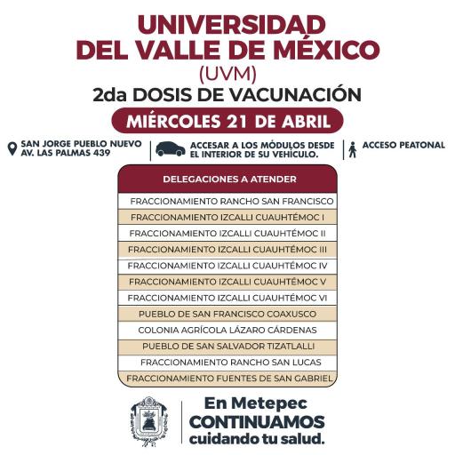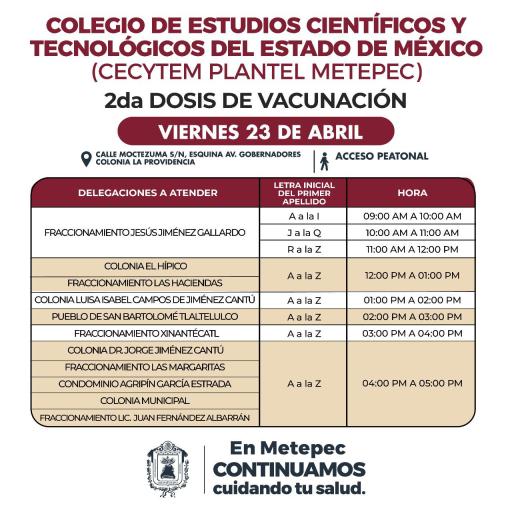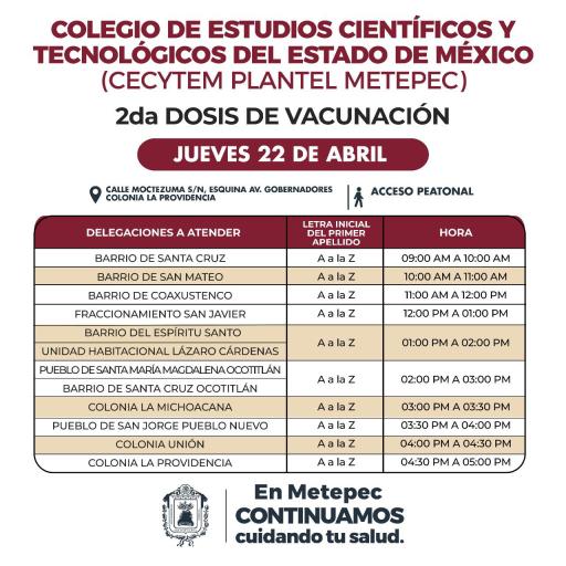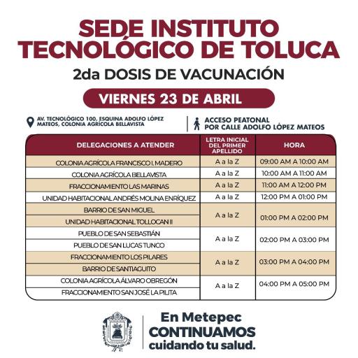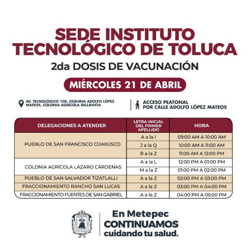 Del 21 al 23 de abril, de 9:00 a 17:00 horas, se realizará el ejercicio de salud en las mismas sedes donde se llevó a cabo hace un mes: el Colegio de Estudios Científicos y Tecnológicos del Estado de México (CECyTEM) ubicado sobre la avenida Gobernadores y calle Moctezuma; el Tecnológico Nacional de México antes Tecnológico de Toluca y en la Universidad del Valle de México (UVM), esta última con la modalidad, además, de vacunación en automóvil.