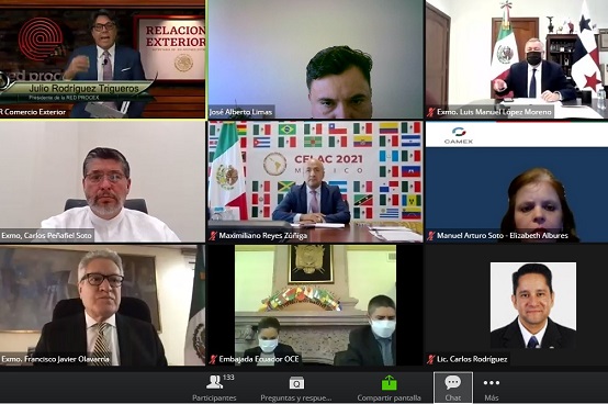 Hoy, 20 de abril, se llevó a cabo el webinar “Relaciones Económicas con Latinoamérica”, organizado conjuntamente por la Secretaría de Relaciones Exteriores, el Consejo de Cámaras y Asociaciones Empresariales del Estado de México (CONCAEM) y la Red PROCEX de Promotores de Comercio Exterior.