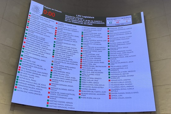 De 117 senadores, algunos presentes y otros de manera virtual, este jueves, durante la sesión ordinaria, 65 aprobaron en lo general reformas y adiciones a diversas disposiciones de la Ley de Hidrocarburos, 47 votaron en contra, mientras que cinco del Partido Verde y uno del PT, se abstuvieron, por lo que un voto se agregó sin que nadie se diera cuenta.