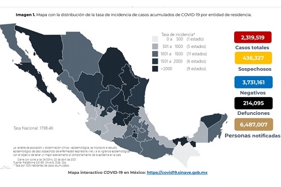 Ssa reportó este jueves 3 mil 708 nuevos casos Covid-19 para un acumulado de 2 millones 319 mil 519 contagios, los fallecimientos incrementaron en 498 para un total de 214 mil 95 como consecuencia de la enfermedad y 27 mil 408 personas con epidemia activa.