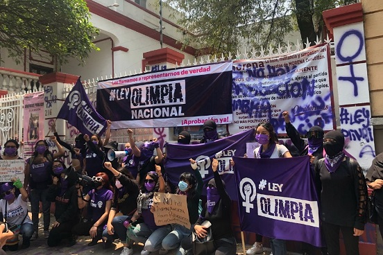 Feministas que están a favor de la aprobación de la Ley Olimpia a nivel nacional protestaron en las distintas sedes de los partidos políticos para que sus representantes de los grupos parlamentarios voten a favor de esta ley.