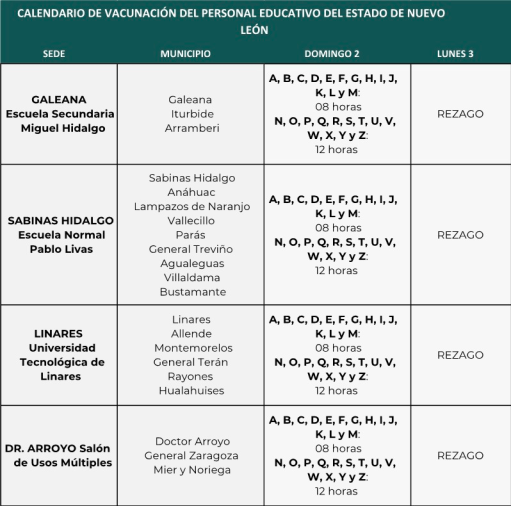 Por lo anterior, se convoca al personal educativo para acudir a las sedes de vacunación en un horario de 8:00 a 18:00 horas, de acuerdo a la inicial de su primer apellido y a la ubicación de su residencia, conforme al siguiente calendario: