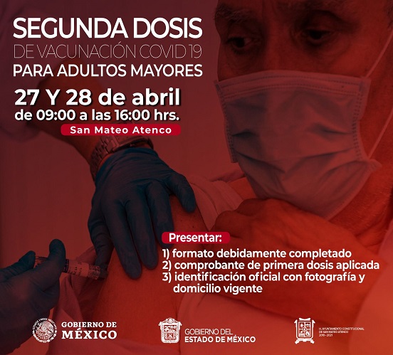 El Gobierno Municipal informó que este martes 27 y miércoles 28 de abril tendrá lugar la aplicación de la segunda dosis de la vacuna del covid19, para adultos mayores del municipio.
