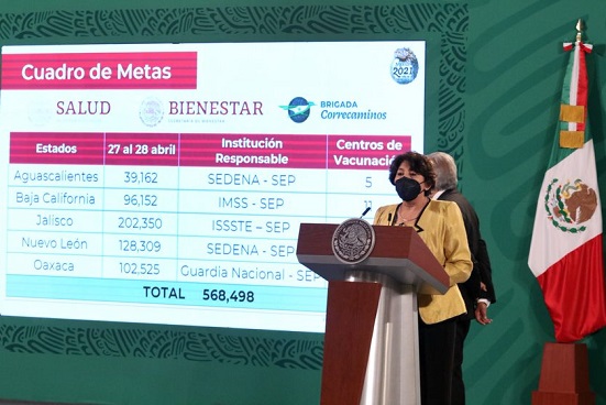 Asimismo, informó que, a partir de hoy, la jornada de vacunación continúa en los estados de Aguascalientes, Baja California, Jalisco, Nuevo León y Oaxaca, donde se inmunizará a 568 mil 498 personas, en 60 centros y macrocentros de vacunación, con el apoyo de la Brigada Correcaminos y la Secretaría de Salud.
