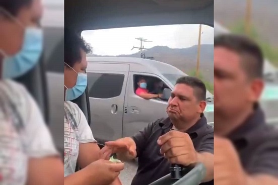 El chofer, a pesar que dice tiene sello fiscal, argumenta que a sus compañeros ya les han sacado (dinero) más adelante, mientras el sujeto sube a la unidad y le pide que avance hacia otro punto de la carretera.