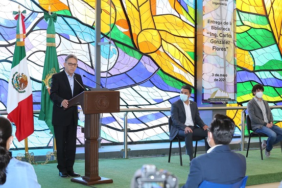 Con una inversión de 16.5 millones de pesos, el rector de la Universidad Autónoma del Estado de México, Alfredo Barrera Baca, inauguró la Biblioteca “Ing. Carlos González Flores” de la Facultad de Ingeniería, ubicada en el icónico e histórico edificio que alberga el vitral “Los cuatro elementos” del artista plástico Leopoldo Flores.