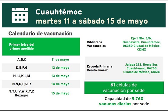 Las sedes de vacunación serán: la biblioteca Vasconcelos en la colonia Buenavista; y en la Escuela Primaria Benito Juárez, en la colonia Roma Sur.