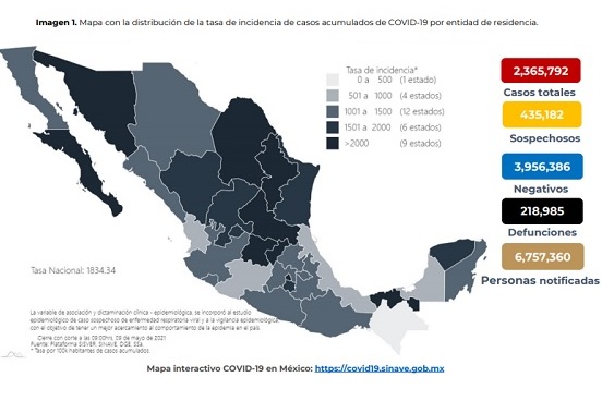 Ssa reporta que incrementaron en mil 175 los casos positivos de Covid-19 sumando 2 millones 365 mil 792 y crecen en 57 las defunciones para un acumulado de 218 mil 985.