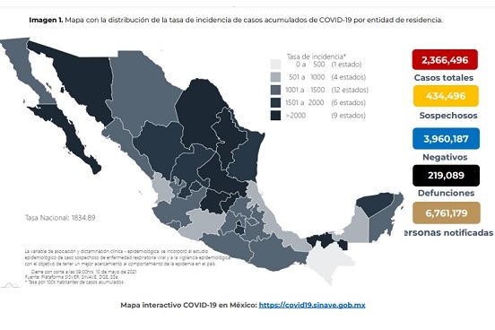 Hasta este lunes suman 2 millones 366 mil 496 casos de covid-19 confirmados, 704 más que el domingo cuando se reportaron 2 millones 365 mil 792 casos. Y suman 219 mil 89 las defunciones, 104 más que un día previo cuando se informó de 218 mil 985.