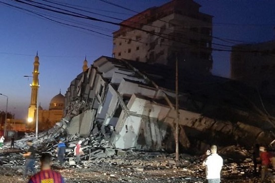 Un ataque aéreo israelí derrumbó hoy un edificio de al menos doce plantas situado en la Franja de Gaza, en el que tienen oficinas varios altos mandos del movimiento Hamás, informaron reporteros de AFP, quien es revelaron que el inmueble está situado cerca de la costa y quedó completamente destruido.