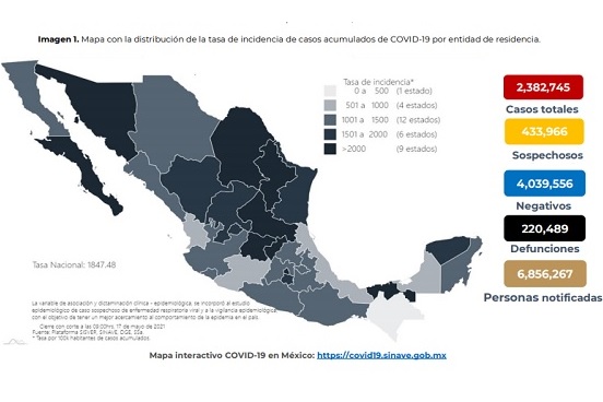 En la conferencia vespertina en Palacio Nacional, se presentó el reporte sobre el comportamiento de la pandemia de Covid-19 en el país, del que resalta que en las pasadas 24 horas se confirmaron 52 fallecimientos para un total de 220 mil 489 hasta el día de hoy. Los casos confirmados incrementaron en 822 para un acumulado de 2 millones 382 mil 745.