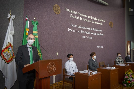 Al encabezar la lectura del cuarto informe de actividades de la directora de la Facultad de Turismo y Gastronomía, Elva Esther Vargas Martínez, el rector destacó que la máxima casa de estudios mexiquense ha adquirido nuevas capacidades y experiencia para asumir los desafíos que impone el vértigo de la transformación nacional y la colaboración mundial.