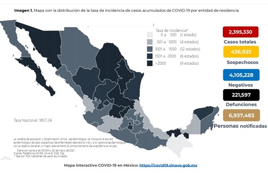 Christian Arturo Zaragoza Jiménez Director de Información Epidemiológica, señaló que a la fecha se han registrado lamentablemente 221 mil 597 defunciones por la enfermedad, 341 más que la víspera. Los casos confirmados incrementaron en 2 mil 586 para un acumulado de 2 millones 395 mil 330.