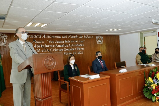 Al acudir al cuarto informe de actividades del director del Plantel de la Escuela Preparatoria «Sor Juana Inés de la Cruz», Cristian González Flores, el rector reconoció el esfuerzo y crecimiento registrado por este espacio universitario, ubicado en el municipio de Amecameca. Destacó el aumento de su matrícula en casi 23 por ciento y su reacreditación en el Nivel I del Padrón de Calidad del Sistema Nacional de Educación Media Superior, con vigencia al año 2024.