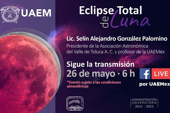 El primer eclipse total de luna de 2021 tendrá lugar este miércoles 26 de mayo, el cual podrá disfrutar toda la comunidad universitaria y el público en general, a partir de las 6:00 horas, través de la página de Facebook de la Universidad Autónoma del Estado de México (UAEM).