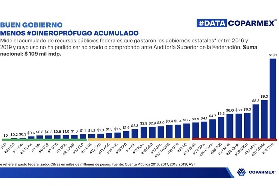 “Buen gobierno. Menos #DineroPrófugo acumulado. Mide el acumulado de recursos públicos federales que gastaron los gobiernos estatales entre 2016 y 2019 y cuyo uso no ha podido ser aclarado o comprobado ante la Auditoría Superior de la Federación. Suma nacional 109 mil millones de pesos”, describe la gráfica.