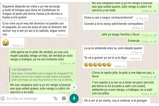 En las imágenes de la conversación que el mando policiaco sostuvo a través de WhatsApp con la empleada de la SSC, éste le pide que salga con él o de lo contario amenaza con mandarla a una zona conflictiva en Cuitláhuac.